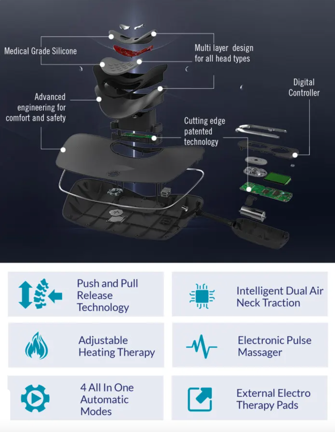 The state of the art ALL IN ONE cervical care device that makes it possible for anyone to have a professional physiotherapy neck traction at home, for their own personal use. It utilizes four functions including: Dynamic Neck Traction, Electric Pulse Therapy, Adjustable Heating, and TENS Massage Technology.