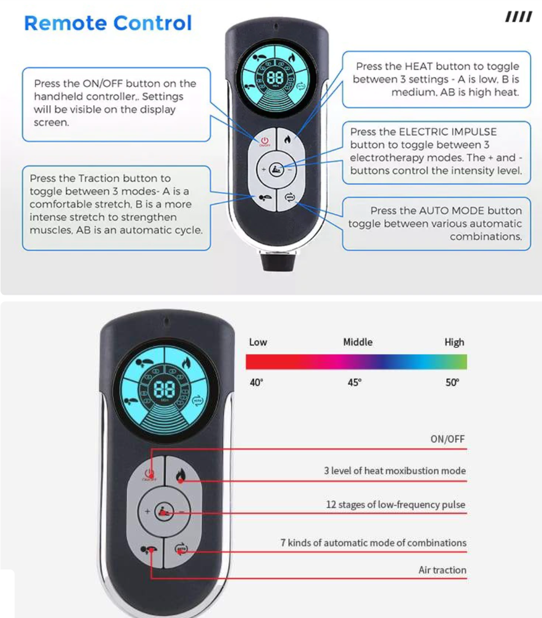 All in One & Easy To OperateCombine all 3 functions at once or adjust the heat and traction individually with the handheld controller.